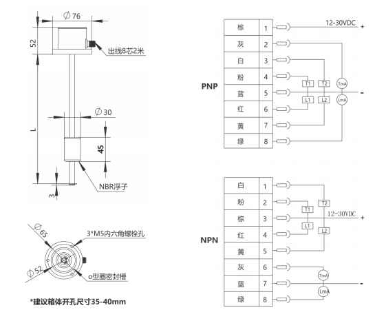 The NT400 electronic liquid level/temperature integrated sensor can simultaneously output multiple signals, meeting the monitoring needs of liquid level and temperature in different places. At the same time, it reduces the number of openings in the user’s box, simplifies and miniaturizes the design, and has a beautiful appearance to meet the equipment upgrade requirements (PNP/NPN/0… 20mA/4… 20mA).